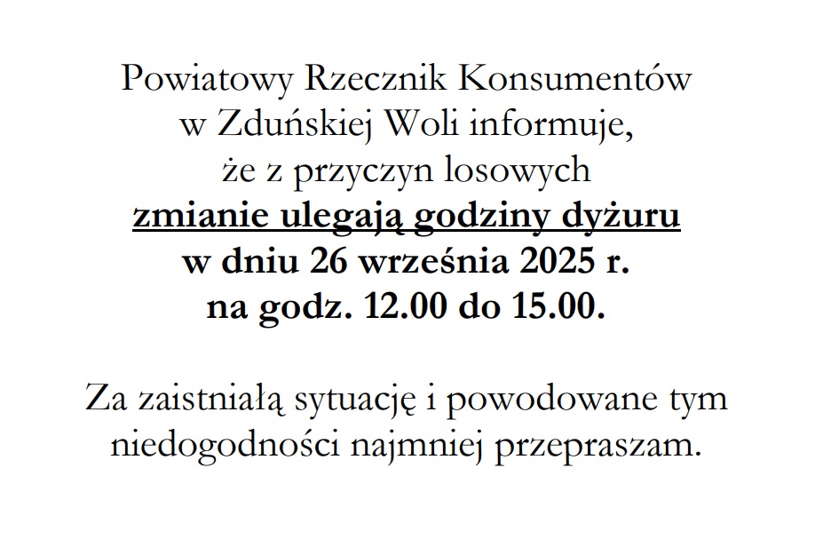 Zmiana godzin dyżyru Powiatowego Rzecznika Konsumentu Czwartek / 25-09-2025Data publikacji, Czwartek / 25-09-2025, Anna Stoczkowska-SmędaAutor, Anna Stoczkowska-Smęda, 32Ilość wyświetleń, 32