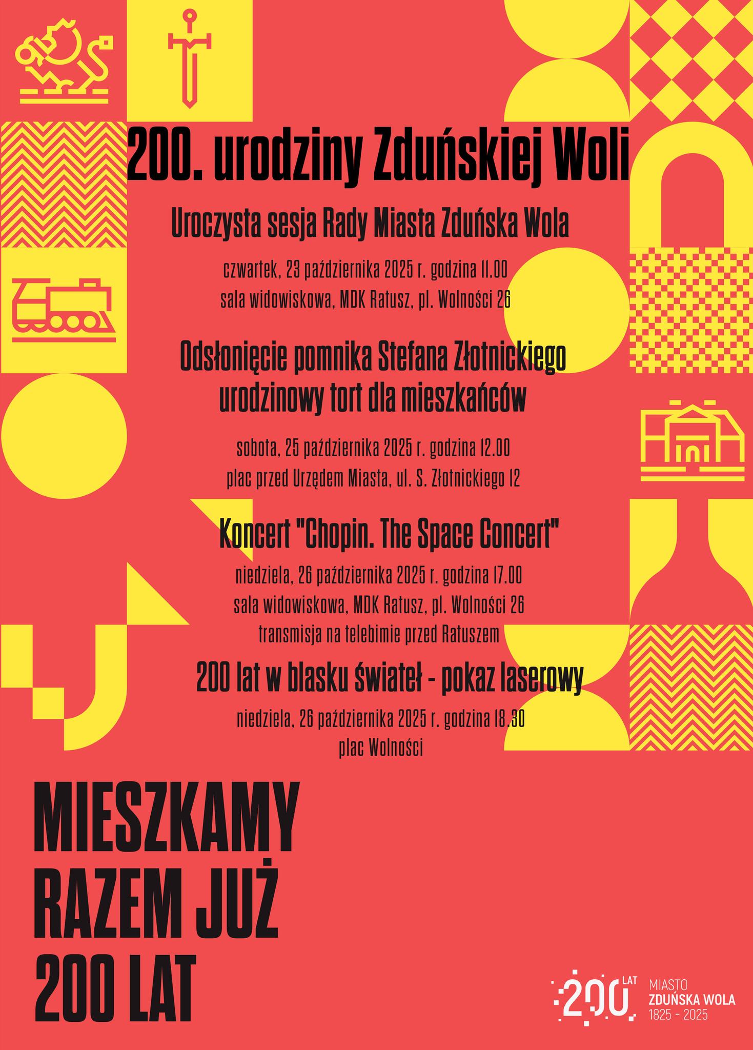200. urodziny Zduńskiej Woli przypadają 25 października 2025 roku. Tego dnia minie dokładnie 200 lat od wydania aktu erekcyjnego, nadającego prawa miejskie Zduńskiej Woli z 25 października 1825 roku.