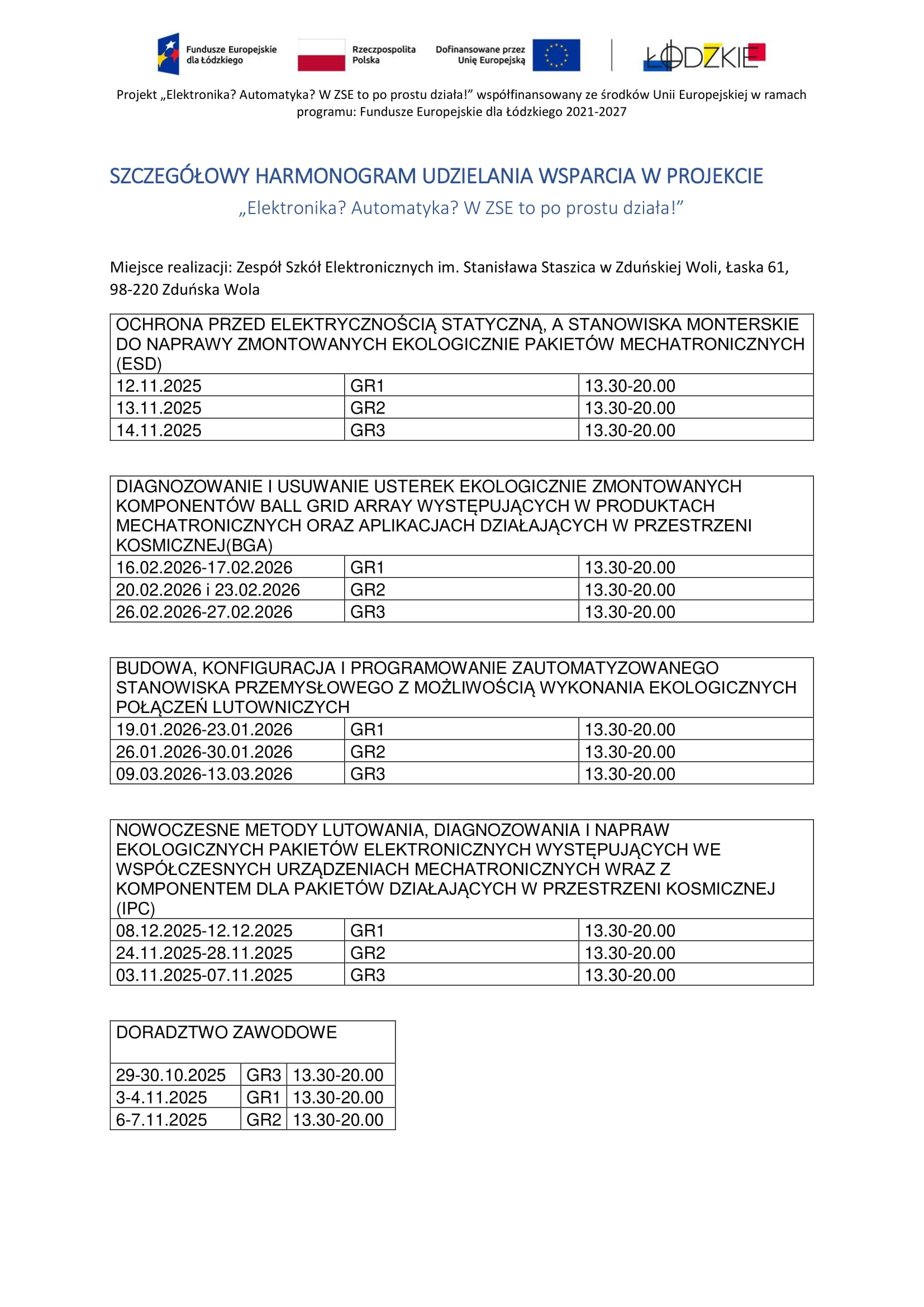 SZCZEGÓŁOWY HARMONOGRAM UDZIELANIA WSPARCIA W PROJEKCIE „Elektronika? Automatyka? W ZSE to po prostu działa!”